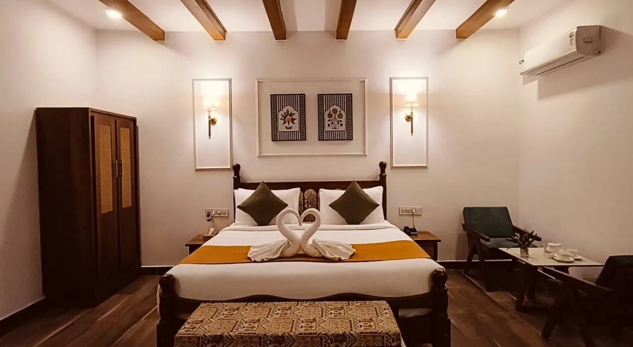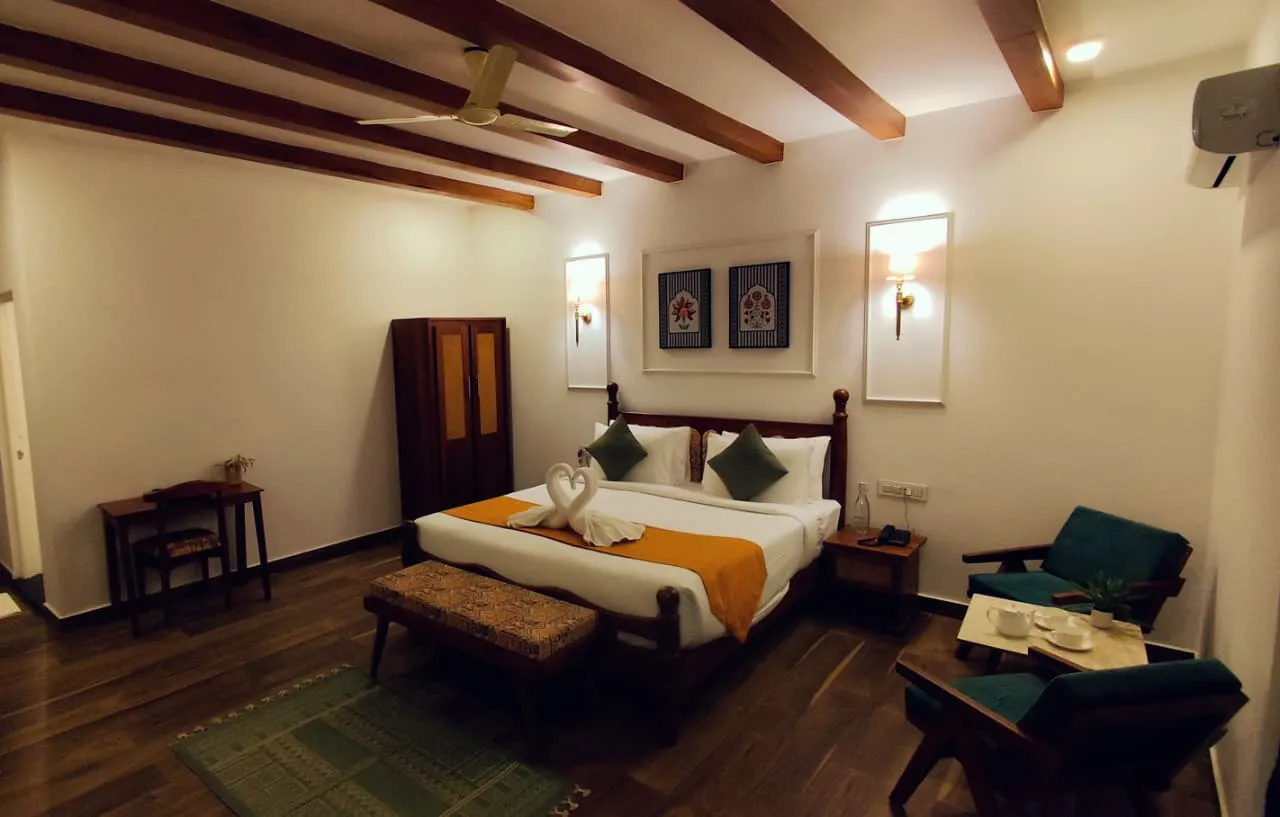 The Marigold Room offers a warm, elegant, and relaxing space, perfect for couples and families. With well-designed interiors and modern comforts, our 12 Marigold Rooms provide a peaceful stay surrounded by nature.